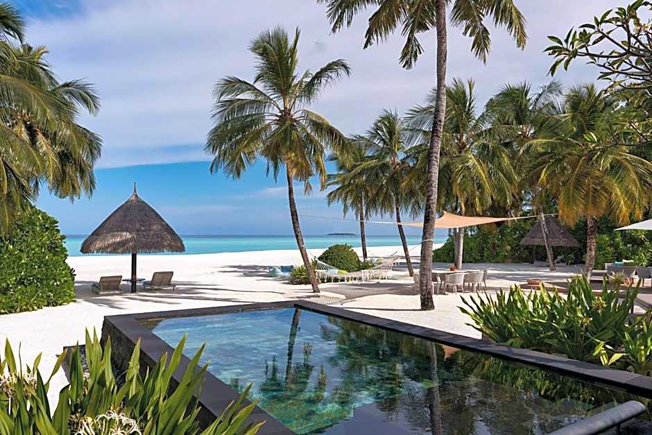 This offer includes: Free Shared Transfer,3 Course Dinner at Reethi Earth and Rabarbaro restaurants, excluding beverage or Dinner Credit of USD 80 per adult per day. The large bedroom offers a king-size bed and stunning ocean views from the floor-to-ceiling windows, and a spacious, sun-drenched en suite with soaking tub. Through the wide villa doors, the airy, spacious layout invites long and lazy days lounging between your living room and sun-lit terrace. Enjoy the privacy of your own swimming pool and stretch of sandy beach at our exclusive Maldives resort. Relax under the swaying palms in your hammock – a standard in all of our villas.
